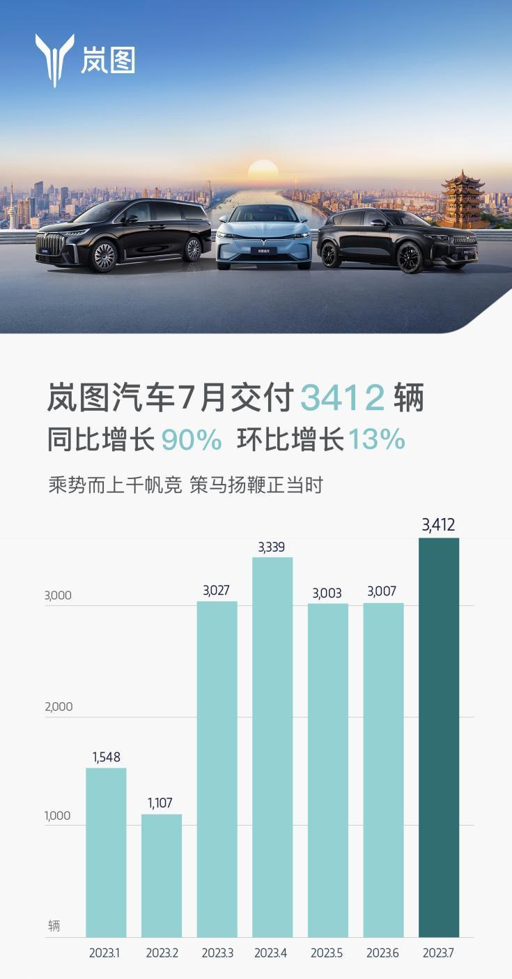 央廣網(wǎng)北京8月1日消息 今日,嵐圖汽車公布2023年7月交付數(shù)據(jù)。2023年7月,嵐圖交付新車3412輛,同比上漲90%,環(huán)比上漲13%。在競爭愈加激烈的市場競爭下,嵐圖汽車憑借其卓越的產(chǎn)品硬實(shí)力,銷量連續(xù)五個(gè)月超3000輛,潛力持續(xù)釋放。