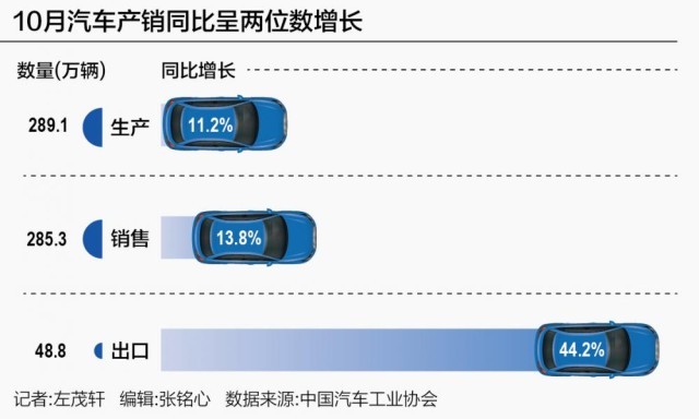 11月10日,中國(guó)汽車(chē)工業(yè)協(xié)會(huì)(下稱“中汽協(xié)”)發(fā)布數(shù)據(jù)顯示,10月,汽車(chē)產(chǎn)銷(xiāo)分別達(dá)到289.1萬(wàn)輛和285.3萬(wàn)輛,同比分別增長(zhǎng)11.2%和13.8%,產(chǎn)銷(xiāo)量創(chuàng)下當(dāng)月歷史同期新高。