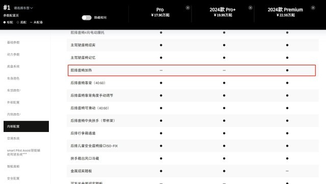 中新經(jīng)緯查詢smart官網(wǎng)發(fā)現(xiàn),前排座椅加熱等功能需要升級(jí)車型才能擁有,普通車型并未將其設(shè)為標(biāo)配。以座椅加熱功能為例,官網(wǎng)顯示,有該項(xiàng)配置的smart#1的2024款Premium為22.59萬元起,而未將該功能設(shè)為標(biāo)配的Pro車型,其價(jià)格為17.9萬元起。