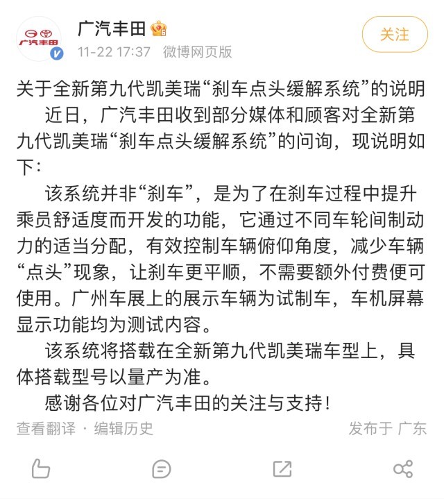 上述功能也曾引發(fā)網(wǎng)友熱議。對此,廣汽豐田公開回應(yīng)稱該系統(tǒng)是為了在剎車過程中提升乘員舒適度而開發(fā)的功能,并非“剎車”,也不需要額外付費(fèi)。