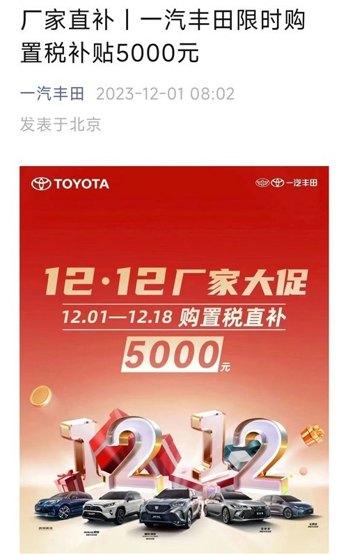 來源:一汽豐田官方微信平臺 一汽豐田官微公告顯示,一汽豐田宣布開啟“雙十二大促”,12月1日至12月18日期間,購買格瑞維亞、RAV4榮放、皇冠陸放等部分車型限時享受購置稅補(bǔ)貼5000元,置換最高可享6000元置換補(bǔ)貼。 緊隨其后,神龍汽車推出“置換增購禮”“保險(xiǎn)補(bǔ)貼禮”“金融免息禮”“整車質(zhì)保禮”等12重寵粉知音豪禮,其中置換至高享10000元補(bǔ)貼,增購至高享5000元補(bǔ)貼。舉例來看,購買新508L、新4008、2023款天逸C5 AIRCROSS,可享10000元置換補(bǔ)貼、5000元增購補(bǔ)貼,2年免息以及5000元保險(xiǎn)補(bǔ)貼。 零跑汽車也同日推出歲末限時鉅惠活動,覆蓋旗下零跑C11、零跑C11超級增程、零跑C01、零跑C01超級增程、零跑T03等5款車型?;顒訒r間自今年12月1日起至12月31日,用戶繳納5000元定金,可享受至高17000元現(xiàn)金優(yōu)惠,還推出選裝基金、金融貼息等。