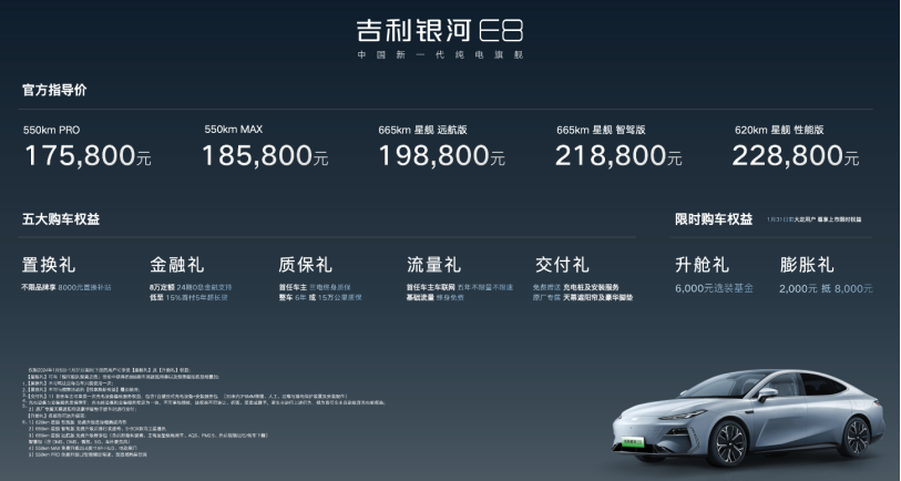 2024年1月5日,吉利汽車銀河E8上市并同步開啟交付。新車共推出5個(gè)版型,包括單電機(jī)后驅(qū)和雙電機(jī)四驅(qū)兩種動(dòng)力系統(tǒng)及550公里、620公里和665公里三個(gè)續(xù)航版本,售價(jià)區(qū)間為17.58-22.88萬元。