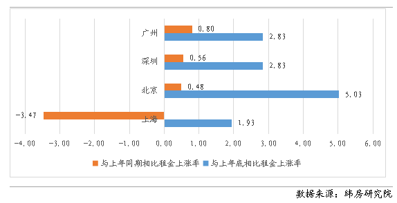 與去年同期相比,一線城市住房租金以微漲為主,其中廣州住房租金上漲0.80%,深圳上漲0.56%,北京上漲0.48%,但上海下降3.47%。