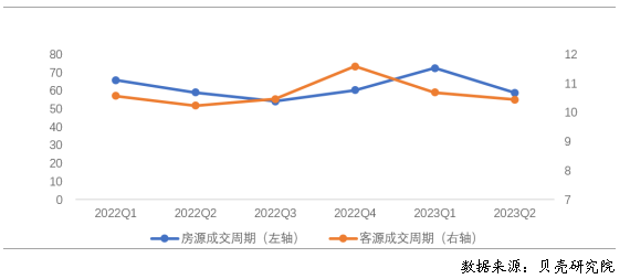 房客源活躍度提升,房屋出租周期先升后降。根據(jù)貝殼研究院數(shù)據(jù),2023年上半年重點(diǎn)40城新增掛牌房源量、新增帶看客戶量同比、環(huán)比均增加超過(guò)9%。房源端、客源端活躍度均保持上升的趨勢(shì)。2023年上半年重點(diǎn)40城房客源成交周期分別為65.0天、10.5天。相比于去年,今年上半年房源成交周期總體有所延長(zhǎng)。從季度來(lái)看,房源供應(yīng)量的增加同時(shí)使得2023年一季度房屋出租周期比2022年四季度上升12.1天,但2023年二季度房源成交周期比一季度縮短13.6天,出房速度有所加快。從客源端來(lái)看,一、二季度客源成交周期連續(xù)縮短,顯示出租客的租房難度在降低,可選擇房源量較多,有利于租客選擇匹配自身需求的房源。