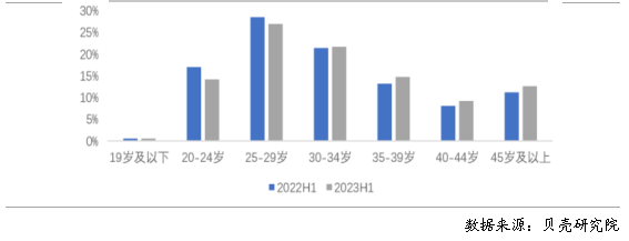 圖6 2022年上半年、2023年上半年重點(diǎn)40城租客年齡結(jié)構(gòu)分布