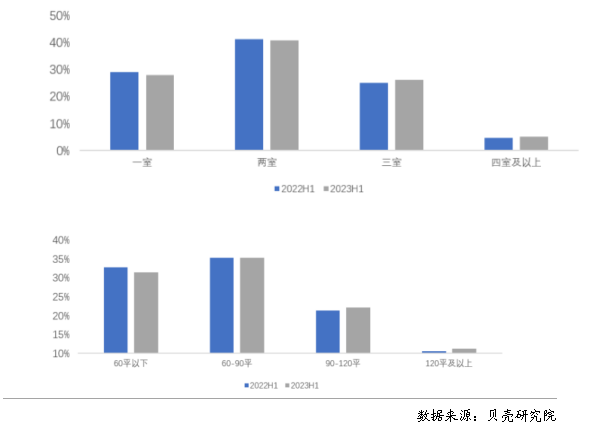 圖3 2022年上半年、2023年上半年重點(diǎn)40城租賃成交結(jié)構(gòu)分布