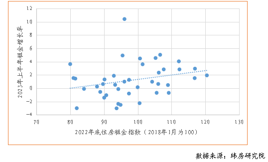 圖9 2023年上半年重點(diǎn)40城住房租金增長(zhǎng)率與2022年底住房租金指數(shù)關(guān)系