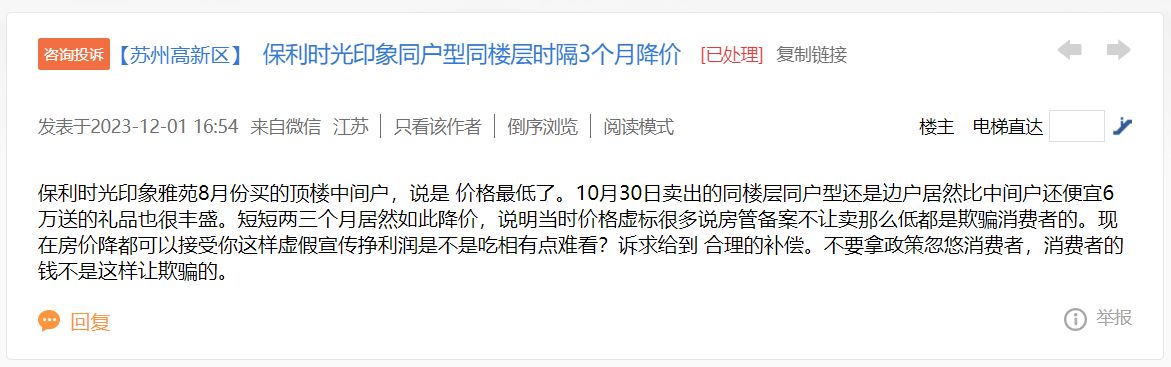 澎湃新聞在蘇州陽(yáng)光便民網(wǎng)上看到,12月1日,有網(wǎng)友留言表示:蘇州高新區(qū)保利時(shí)光印象雅苑項(xiàng)目,“8月份買(mǎi)的頂樓中間戶(hù),說(shuō)是價(jià)格最低了。10月30日賣(mài)出的同樓層同戶(hù)型還是邊戶(hù),居然比中間戶(hù)還便宜6萬(wàn)元,送的禮品也很豐盛。短短兩三個(gè)月居然如此降價(jià),說(shuō)明當(dāng)時(shí)價(jià)格虛標(biāo)。”