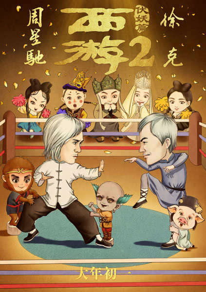 此外,隨預(yù)告片一同發(fā)布的“對(duì)壘版”漫畫海報(bào)也非常逗趣:周星馳與徐克兩人化身武林高手的漫畫形象在擂臺(tái)上展開對(duì)壘。周星馳太極拳的姿勢(shì)與影片《功夫》中阿星的形象極為相似,徐克的招式動(dòng)作也很有黃飛鴻的架勢(shì)。而化身為Q版造型的師徒四人則為擂臺(tái)上的兩人按摩捶腿、加油助威,充滿童趣。