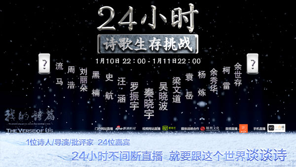據(jù)了解,從1月10日晚22:00開始,秦導邀請了24位各界知名人士,24小時不間斷直播接力談詩歌。自媒體“羅輯思維”創(chuàng)始人羅振宇,著名財經(jīng)作家、財經(jīng)自媒體“吳曉波頻道”創(chuàng)始人吳曉波,國際著名詩人楊煉,香港著名文化人梁文道,湖南衛(wèi)視著名主持人汪涵,自媒體人袁岳,著名知識分子余世存,詩人余秀華,詩人、詩歌自媒體“讀首詩再睡覺”公號主編流馬,編劇史航,金馬獎最佳紀錄片導演周浩,歐洲著名漢學家柯雷,著名音樂人黑楠等人,將通過現(xiàn)場、電話連線、視頻等多種方式參與本次在線直播活動,而鳳凰衛(wèi)視著名主持人曹景行、著名主持人崔永元以及詩歌評論家唐曉渡也有望一起參與。