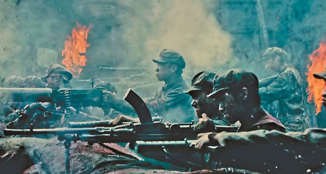 相比于以往表現(xiàn)毛澤東同志革命故事的作品,此次《浴血榮光》在如何表現(xiàn)建軍過程的影像上下了很大功夫。導(dǎo)演陳力做了精心設(shè)計(jì),她讓影像不僅還原歷史,還富有更為深刻的寓意。比如,毛澤東在湖南發(fā)動(dòng)秋收起義前,前往萍鄉(xiāng)安源煤礦的兵工廠,和工農(nóng)兄弟一起鍛造鐮刀與斧頭等武器,他在畫面的黃金分割點(diǎn)慷慨演說,鋼鐵熔爐里火紅的光芒照射在他身上,充滿油畫般的力量感和造型感,也寓意著人民軍隊(duì)就誕生于工農(nóng)中。