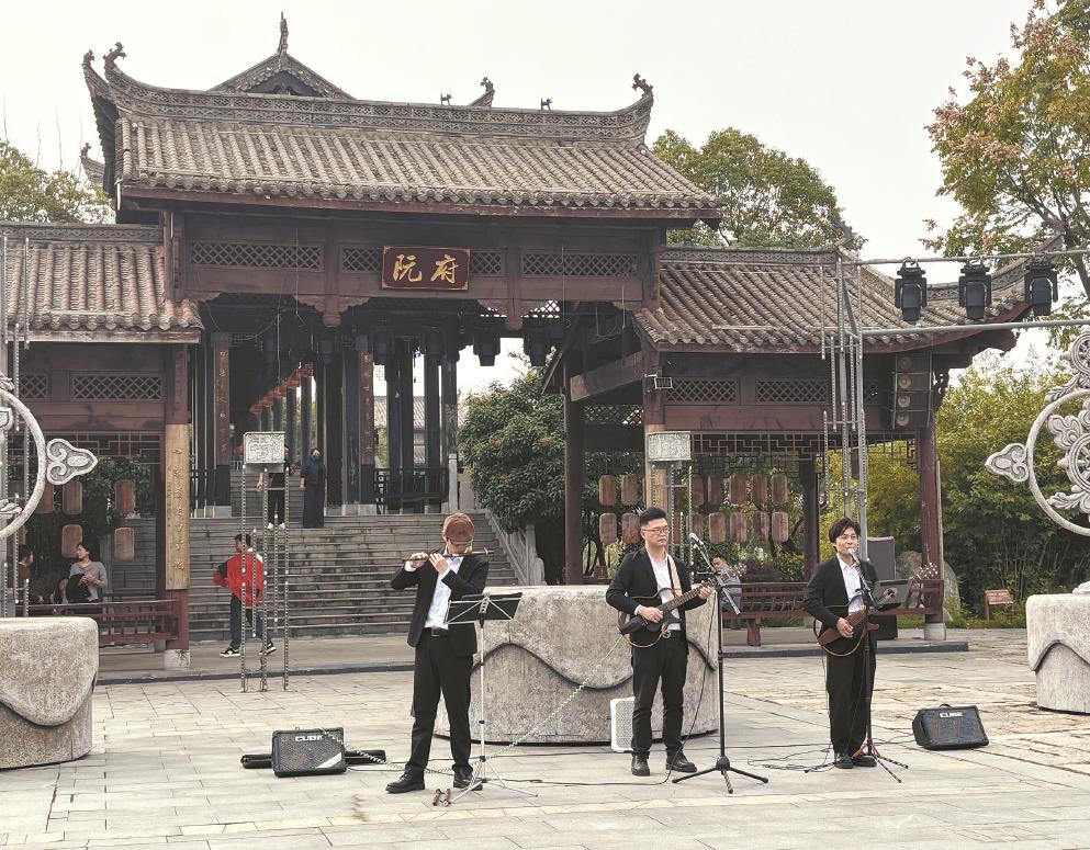 演藝新空間向外擴展,蕪湖鳩茲小鎮(zhèn)內(nèi),上海街藝音樂組合正在演出。文匯報記者 孫彥揚攝