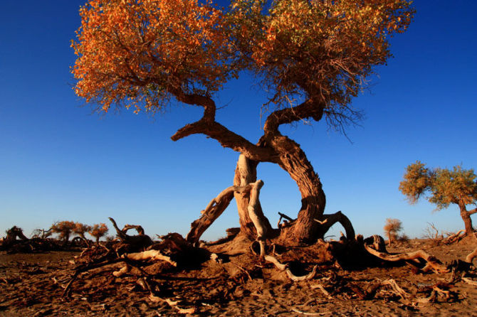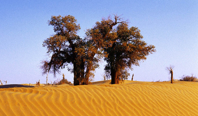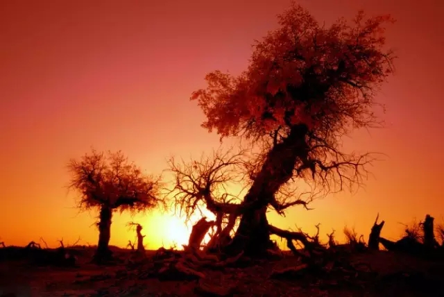 胡楊林是塔里木河流域典型的荒漠森林草甸植被類型,從上游河谷到下游河床均有分布。雖然胡楊林結(jié)構(gòu)相對簡單,但具有很強(qiáng)的地帶性生態(tài)烙印。無論是朝霞映染,還是身披夕陽,它在給人以神秘感的同時,也讓人解讀到生機(jī)與希望。據(jù)有關(guān)資料顯示,人們還夸贊胡楊巨大的生命力是“三個一千年”,即活著一千年不死,死后一千年不倒,倒后一千年不朽。
