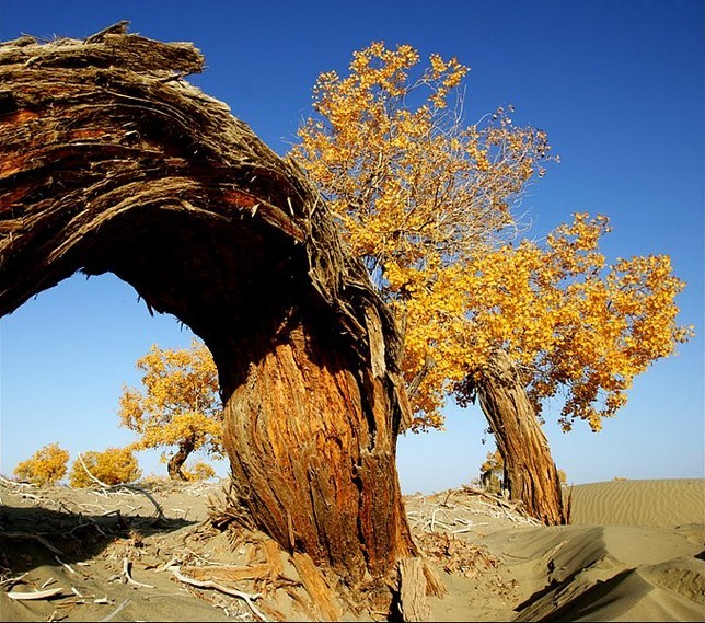 巴州旅游局局長馬彥成說, 由于胡揚(yáng)具有驚人的抗干旱、御風(fēng)沙、耐鹽堿的能力,能頑強(qiáng)地生存繁衍于沙漠之中,因而也被人們贊譽(yù)為“沙漠英雄樹”。巴州輪臺縣羅布人村寨、羅布湖、及若羌縣的阿拉干沿途景色都非常迷人,希望游客到此賞游,將會領(lǐng)略到不一樣的美麗風(fēng)光。