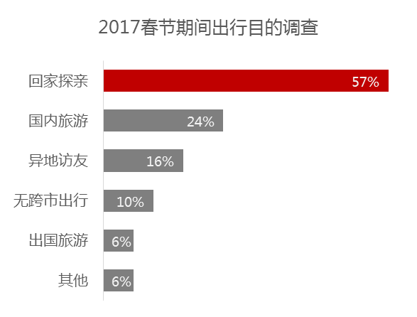 《報告》關(guān)于2017年春節(jié)跨市出行(長途出行)意愿的在線問卷調(diào)查數(shù)據(jù)顯示,“回家探親”是受訪者春節(jié)期間長途出行的第一大動機,“國內(nèi)旅游”則是第二大出行動機??傮w而言,受訪者能夠明確給出的春節(jié)出行動機中,除了“回家探親”,就是旅游(國內(nèi)游和出境游)。這表明,居民2017年春節(jié)期間的旅游消費意愿強烈,旅游過年已經(jīng)成為較為主流的過年方式。