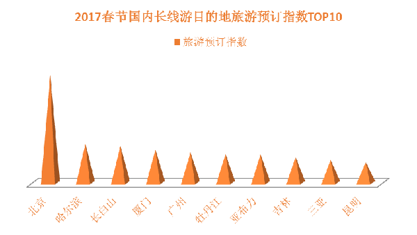 一般情況下,春節(jié)期間的國內(nèi)長線游(行程3日以上,居住地300公里外)需求的出游人數(shù)在總體長線游需求中占比最大。《報告》數(shù)據(jù)顯示,北京、哈爾濱、長白山、廈門、廣州、牡丹江、亞布力、吉林、三亞、昆明是2017年春節(jié)期間最熱門的十個目的地(以《報告》發(fā)布時的線路預(yù)訂數(shù)據(jù)統(tǒng)計),其中哈爾濱、長白山、牡丹江、亞布力、吉林五個目的地全部來自東北地區(qū),春節(jié)期間冰雪游線路的火爆是它們上榜的共同原因,廈門、三亞、昆明等則為黃金周國內(nèi)游傳統(tǒng)熱門目的地。另外,不同城市居民春節(jié)國內(nèi)長線游的目的地偏好略有差異,例如,北京最受歡迎的春節(jié)國內(nèi)游目的地主要有廣州、珠海、哈爾濱、長白山,上海最受歡迎的春節(jié)國內(nèi)游目的地主要有長白山、北海、三亞、北京等,廣州最受歡迎的春節(jié)國內(nèi)游目的地主要有貴陽、張家界等。