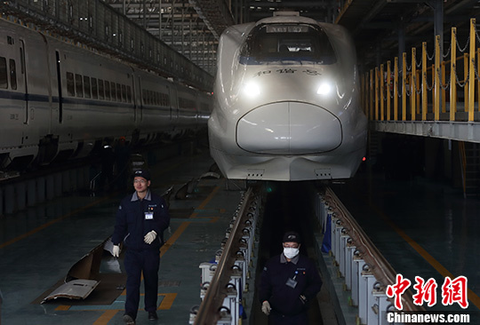 1月15日,南京動車運(yùn)用所的工作人員對滬寧城際動車組列車進(jìn)行精檢細(xì)修,通過全面的“體檢”確保其安全運(yùn)行。據(jù)悉,春運(yùn)期間,上海鐵路局開行客車總數(shù)達(dá)1053對,其中安排動車組達(dá)到663對,占比63%,運(yùn)力為歷年之最。
