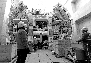 北京晨報(bào)記者在現(xiàn)場看到,各種吊車、大型作業(yè)機(jī)器正在緊張作業(yè)中。記者走到隧道“洞口”處看到, 腳下一臺(tái)巨型的盾構(gòu)機(jī)呈現(xiàn)在眼前,由于隧道采用明挖法、暗挖法、盾構(gòu)法相結(jié)合的施工作業(yè)方法,據(jù)記者目測,從盾構(gòu)機(jī)最底端到記者所在的地面約有七八層樓高。幾十名施工人員正冒著寒風(fēng)對盾構(gòu)機(jī)進(jìn)行組裝、吊裝。北京晨報(bào)記者了解到,這臺(tái)巨型盾構(gòu)機(jī)直徑達(dá)11米左右。