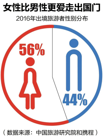 而在性別上,女性比男性更愛走出國(guó)門。中國(guó)旅游研究院和攜程的報(bào)告顯示,根據(jù)在線出境游的性別、年齡統(tǒng)計(jì),2016年出境旅游者中,56%是女性,44%是男性,女性比例高12個(gè)百分點(diǎn)。