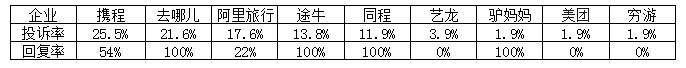 數(shù)據(jù)顯示,各省份旅游投訴中,涉及江蘇的投訴最多,占全國(guó)各省份旅游投訴量的19.2%,上海、河北、遼寧、浙江和四川并列第二,各占7.7%。在線旅游企業(yè)投訴中,涉及攜程旅行網(wǎng)的投訴最多,占在線旅游企業(yè)投訴總量的25.5%,去哪兒網(wǎng)(21.6%)排第二,阿里旅行·去?。?7.6%)排第三。其他被投訴的企業(yè)還有途牛旅游網(wǎng)、同程旅游、藝龍旅行網(wǎng)、驢媽媽旅游網(wǎng)、美團(tuán)網(wǎng)和窮游網(wǎng)。本月同程旅游、去哪兒網(wǎng)、途牛旅游網(wǎng)和驢媽媽旅游網(wǎng)回復(fù)率均為100%,驢媽媽旅游網(wǎng)回復(fù)耗時(shí)最短,平均回復(fù)時(shí)長(zhǎng)為17個(gè)小時(shí)。