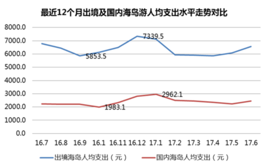 《報告》提供的同程旅游海島游消費數(shù)據(jù)顯示,最近一年(2016年7月至2017年6月)出境海島游消費人群用于購買旅游產(chǎn)品(線路、交通、住宿等,不含購物消費)的人均支出為6340.6元,國內海島游人均支出為2368.9元。從時間軸來看,出境海島游和國內海島游的人均支出水平明顯與出游客流的季節(jié)呈現(xiàn)出同步變化趨勢,出境海島游旺季人均支出最高可達7339.5元,國內海島游旺季人均支出最高可達2962.1元。