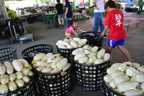 臺東在地苦瓜、絲瓜滯銷,價格下跌,在果菜市場幫忙的小朋友,請大家多采購好吃又便宜的苦瓜。(圖片來源:臺灣《中時電子報》)