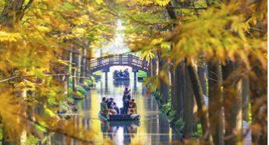 初冬時節(jié),江蘇興化里下河國家濕地公園層林盡染、色彩斑斕,如畫美景吸引不少游客前來游玩。周社根攝(人民圖片網)