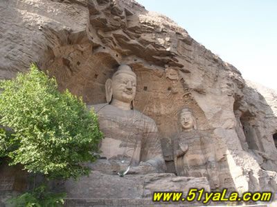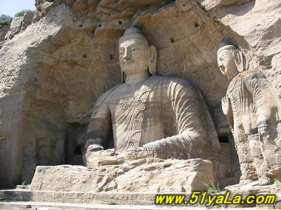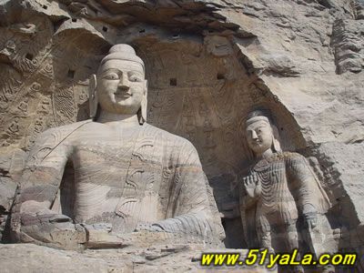 石窟有形制多樣的仿木構(gòu)建筑物,有主題突出的佛傳浮雕,有精雕細(xì)刻的裝飾紋樣,還有栩栩如生的樂舞雕刻,生動(dòng)活潑,琳瑯滿目。其雕刻藝術(shù)繼承并發(fā)展了秦漢雕刻藝術(shù)傳統(tǒng),吸收和融合了佛教藝術(shù)的精華,具有獨(dú)特的藝術(shù)風(fēng)格。它在吸收和借鑒印度犍陀羅佛教藝術(shù)的同時(shí),有機(jī)地融合了中國傳統(tǒng)藝術(shù)風(fēng)格,在世界雕塑藝術(shù)史上有十分重要的地位。對后來隋唐藝術(shù)的發(fā)展產(chǎn)生了深遠(yuǎn)的影響,在我國藝術(shù)史上占有重要地位,也是中國與亞洲國家友好往來、文化交流的歷史見證。今天,它已成為中外游人傾慕和向往的旅游勝地云岡石窟(國家級重點(diǎn)文物保護(hù)單位)是中國三大石窟群之一,也是世界聞明的藝術(shù)寶庫。 云岡兩道山麓,把石窟分成東部、中部和西部。東部的石窟多以佛塔為主,故又稱塔洞。 云岡東部窟群,指云岡石窟東端1—4窟,均為塔洞。這里風(fēng)化比較嚴(yán)重,只有第一窟東壁后下部故事浮雕仍保存較完整。第1、2窟為同期開的一組,鑿于孝文帝遷洛前,窟內(nèi)中央雕造方形塔柱,四面開龕造像。第 1窟主像是彌勒,塔南面下層雕釋迦多寶像,上層雕釋迦像。浮雕五層小塔,是研究北魏建筑的形象資料。第2窟是釋迦像,塔南面下層雕釋迦多寶像,上層雕三世佛。兩窟南壁窟門兩側(cè)都雕有維摩、文殊。第3窟為云岡石窟中規(guī)模最大的洞窟,前立壁高約25米,傳為曇曜譯經(jīng)樓??叻智昂髢墒?。前室上部左右各雕一塔,中雕方形窟室,主像為彌勒,壁面滿雕千佛。后室南面兩側(cè)雕刻有面貌圓潤、肌肉豐滿、農(nóng)紋流暢的一佛三菩薩。坐像高約10米,二菩薩立像高6.2米。從風(fēng)格和雕刻手法上看,很可能是初唐時(shí)的作品。第 4窟風(fēng)化水蝕嚴(yán)重,平面呈矩形.中央雕方形立柱,東壁交腳彌勒像保存較完整,南壁窟門上方有北魏正光年間銘記,是云岡石窟現(xiàn)存最晚的銘記。 云岡第5、6窟在云岡石窟群中部,為孝文帝遷洛前約465—494年開鑿的一組雙窟。廟前有清順治八年(1651)建造的五間四層木樓閣,朱紅柱欄,琉璃瓦頂,頗為壯觀。第5窟開作橢圓形草廬形式,分前后室。后室北壁本尊為釋迦牟尼坐像,高17米,為云岡最大的佛像,外部經(jīng)唐代泥塑重裝。這尊佛像,膝上可站上120人,一只腳可站立12人。窟內(nèi)滿雕佛龕造像。窟西側(cè)刻有兩佛對坐在菩提樹下,頂部浮雕飛天,線條優(yōu)美。第 6窟平面近方形,中央是一個(gè)連接窟頂?shù)亩臃叫嗡?,高約14米,塔柱上雕有四方佛,上面四角各有一座九層出檐小塔,馱于象背上。窟四壁滿雕佛、菩薩、羅漢、飛天等造像??唔斢腥T天及各種騎乘,令人目不暇接。東西兩壁刻有著名的“佛傳圖”,形象地描繪了釋迦牟尼由誕生、出家、降魔、問道、成佛的一連串故事,展示了佛教徒所幻想的極樂世界。里面有宮殿樓閣、仙人飛樂、斗牛鬼怪、珍禽異獸、四時(shí)花卉、高山流水等,組成一幅幅奇妙生動(dòng)的圖畫,散發(fā)著濃郁的生活氣息。此窟規(guī)模宏偉,雕飾富麗,內(nèi)容豐富,技法精煉,是云岡石窟中有代表性的一窟,也是中期造像藝術(shù)匯集的大檢閱。 云岡第7、8窟位于云岡石窟的中部,為一組雙窟,是云岡石窟第二期開鑿較早的石窟。7窟前現(xiàn)存的木構(gòu)建筑,是清順治八年(1651)修建。7、8窟平面均為長方形,窟內(nèi)布局上下分層,左右分段。7窟后室北壁上層天幕龕的中央,雕一交腳彌勒菩薩像,坐于獅子座上,左右備一倚坐佛像,邊為二脅侍菩薩。內(nèi)容仍為三世佛,且出現(xiàn)了造像組合。下龕為釋迦、多寶二佛并坐像。壁與窟頂相接處雕一排伎樂人像,各執(zhí)樂器演奏。東西兩壁對稱開鑿,壁與頂部相接處雕一排千佛。下分四層雕有 8個(gè)不同的佛龕。南壁鑿有一門一窗,左右兩側(cè)各雕4個(gè)佛龕。門窗間有6個(gè)供養(yǎng)人和伎樂天人像。明窗內(nèi)雕菩薩和禪定比丘。內(nèi)拱內(nèi)雕力上、護(hù)法天王和飛天。頂部分格雕平棋,中為團(tuán)蓮,周雕飛天,把整個(gè)窟頂裝飾得花團(tuán)錦簇。8窟內(nèi)兩側(cè)有五頭六臂乘孔雀的鳩摩羅天,東側(cè)刻有三頭八臂騎牛的摩醯首羅天,這種雕像在云岡石窟極為罕見。第7、8窟與前期窟群比,在形制、內(nèi)容、造像構(gòu)成、題材等方面出現(xiàn)了諸多變化,從中折射出北魏社會(huì)變革的洪流。
