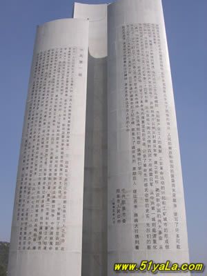高40公尺的主碑 ,形如一把鋒利的刺刀 。主碑的三個面上,分別鐫刻著彭真、徐向前、薄一波的題詞。彭真的題詞是“戰(zhàn)績輝煌,永垂史冊”;徐向前的題詞是“參加百團大戰(zhàn)的烈士們永垂不朽”;薄—波的題詞是“百團大戰(zhàn),抗日戰(zhàn)爭中最光輝的一頁,必將載諸史冊,永放光芒。”