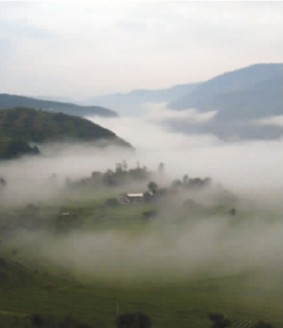 炊煙裊裊的村莊,偷偷地從薄霧里露出惺忪的臉來(lái),時(shí)隱時(shí)現(xiàn),猶如傳說(shuō)中的蓬萊仙島。一個(gè)個(gè)白族村莊沉浸在美輪美奐的仙境之中,整個(gè)峽谷布滿著一幅幅精美絕倫的淡墨山水畫??上У氖谴逯械娜藗冞€未品嘗出做神仙的滋味,霧海就隨著江面吹來(lái)的西風(fēng)越升越高,不一會(huì)兒,就向羅平山頂飄襲而來(lái)。我們幾個(gè)觀霧者迅即被淹沒(méi)在濃濃的云山霧海中,成了騰云駕霧的神仙了。遺憾的是我們還未過(guò)足神仙癮,那些飄蕩在山頂?shù)脑旗F就被熱烈而耀眼的太陽(yáng)光收回去了,讓我們不得不回到人間,仍去做原來(lái)的凡夫俗子。