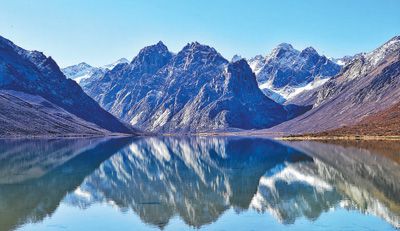 圖為10月下旬,初雪過(guò)后的年保玉則平湖如鏡。記者 姜峰攝
