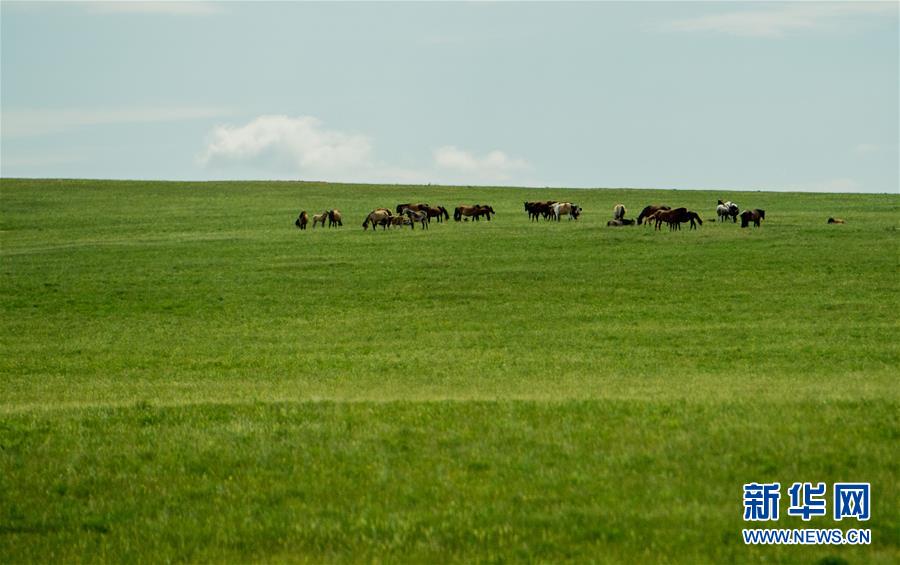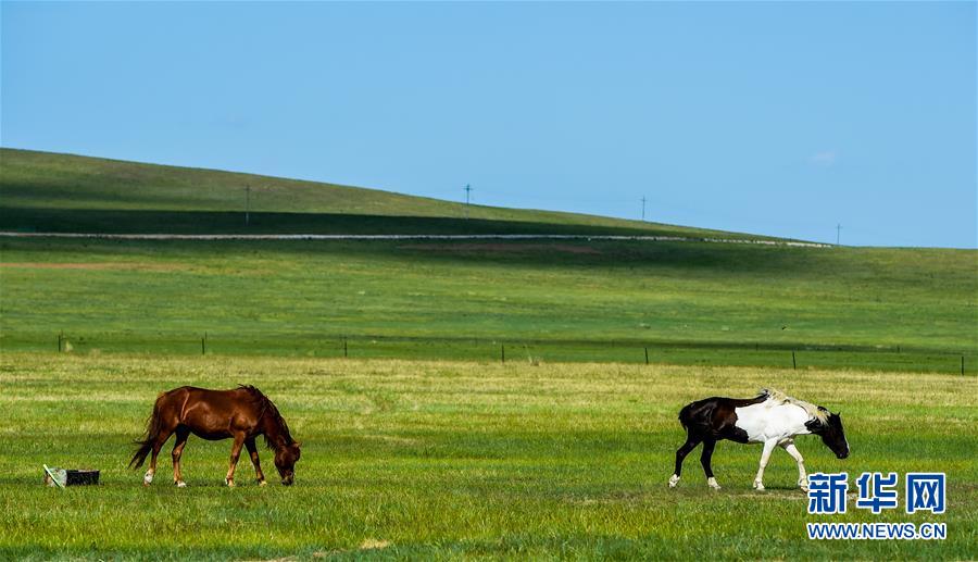 6月17日,馬兒在錫林郭勒盟烏拉蓋草原上吃草。新華社記者 連振 攝