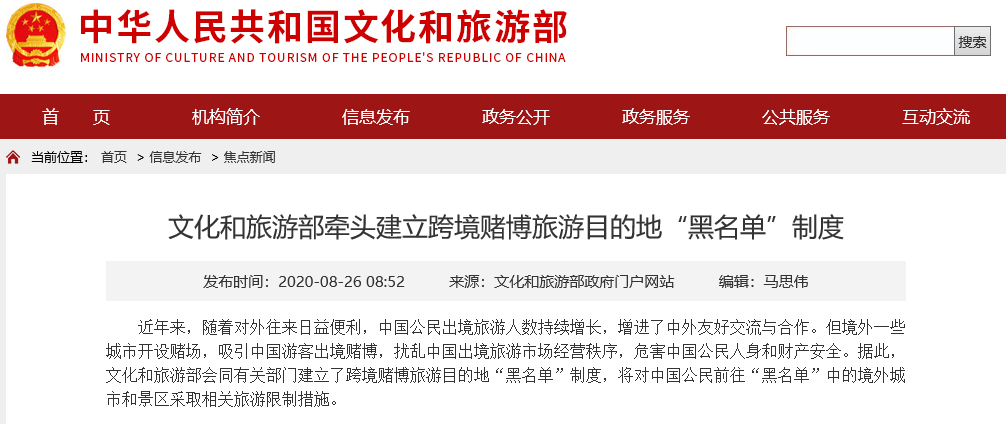 新華網(wǎng)北京8月26日電(記者 薛楓)據(jù)文化和旅游部網(wǎng)站消息,近年來,隨著對(duì)外往來日益便利,中國公民出境旅游人數(shù)持續(xù)增長,增進(jìn)了中外友好交流與合作。但境外一些城市開設(shè)賭場(chǎng),吸引中國游客出境賭博,擾亂中國出境旅游市場(chǎng)經(jīng)營秩序,危害中國公民人身和財(cái)產(chǎn)安全。據(jù)此,文化和旅游部會(huì)同有關(guān)部門建立了跨境賭博旅游目的地“黑名單”制度,將對(duì)中國公民前往“黑名單”中的境外城市和景區(qū)采取相關(guān)旅游限制措施。