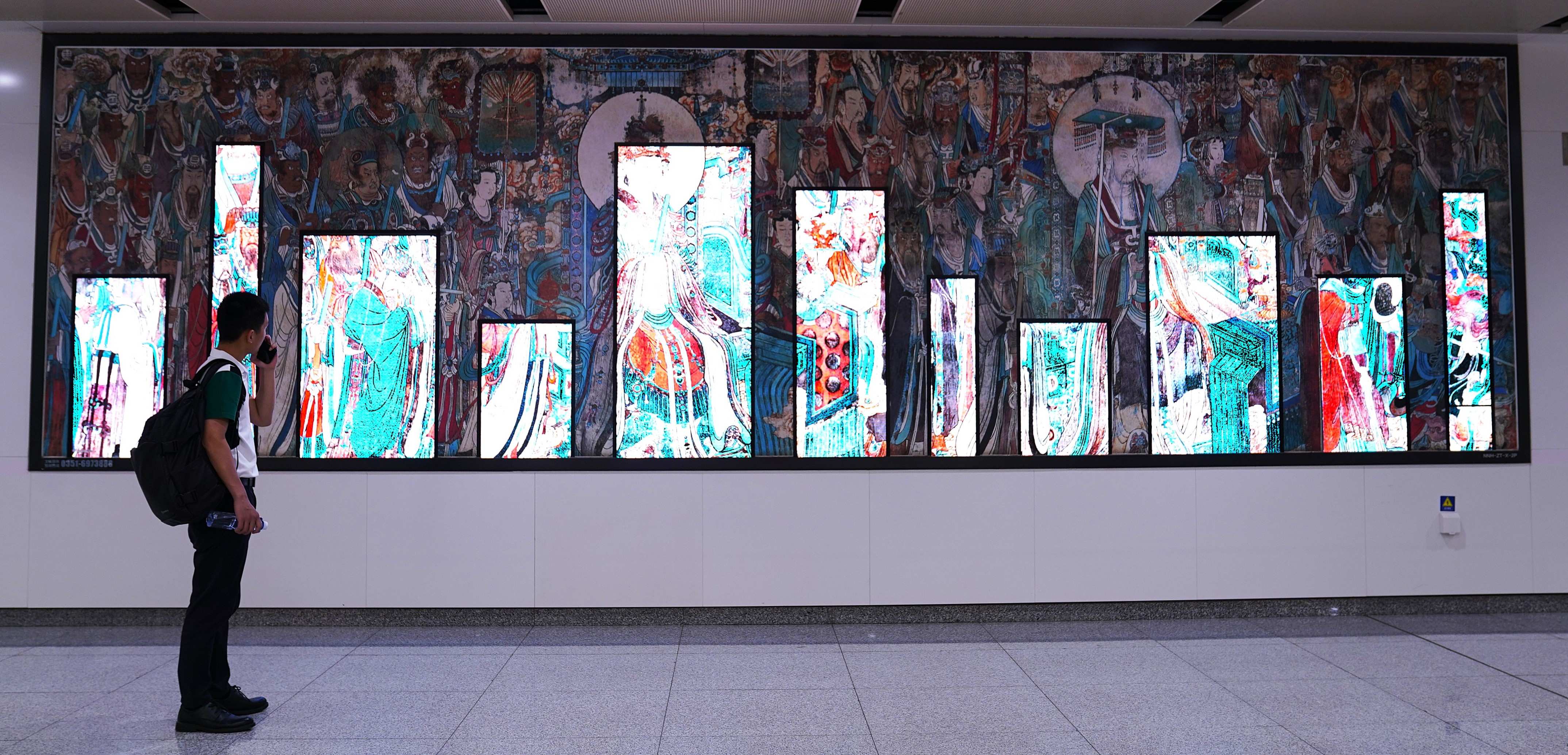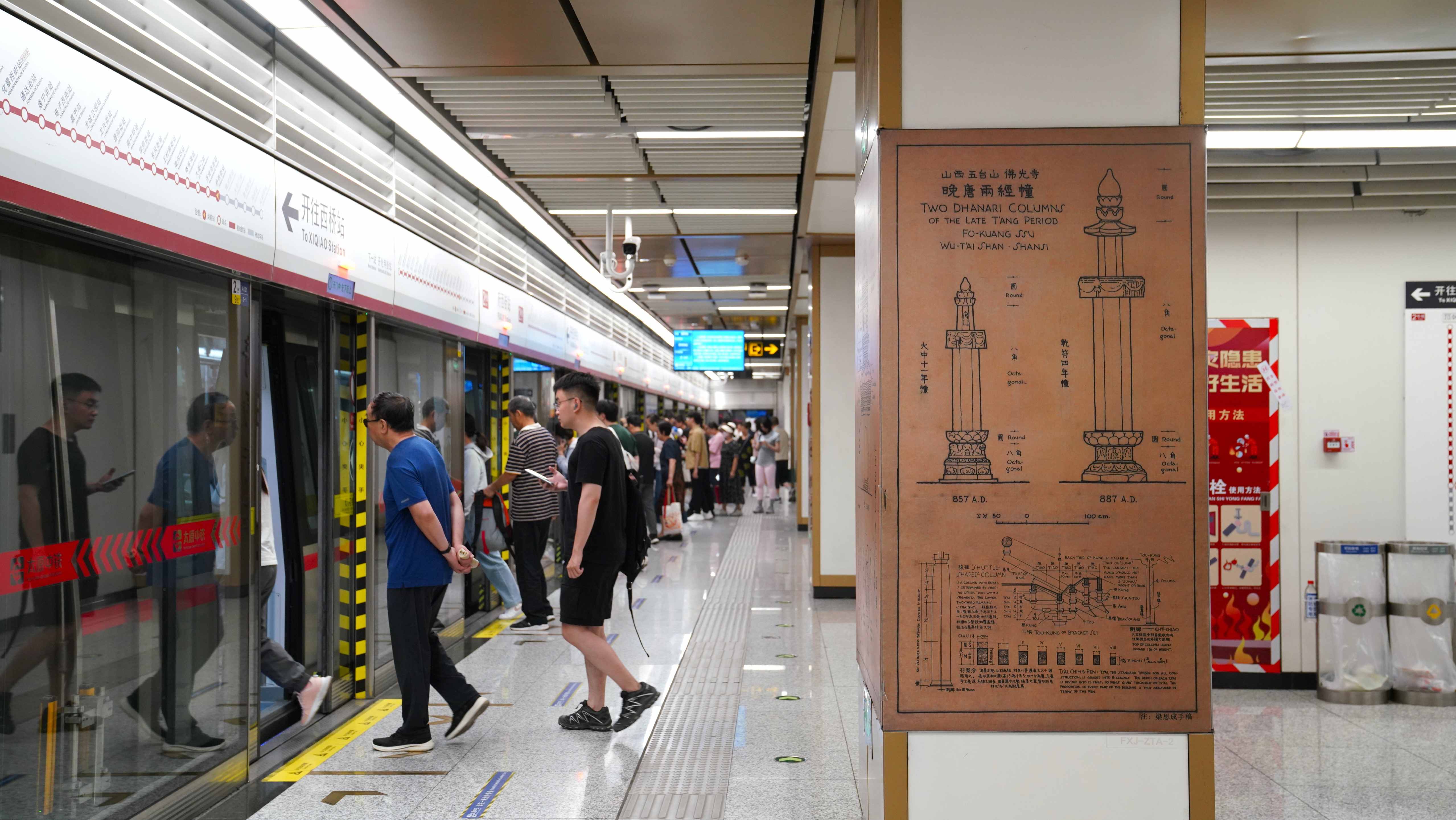 連永樂宮壁畫的絢麗、云岡石窟大佛的莊嚴、應(yīng)縣木塔的精巧,都被藝術(shù)復(fù)刻在站廳里——等車的間隙,有人會盯著壁畫上的飛天出神,有人會摸著梁思成筆下的古塔紋路發(fā)呆,匆忙的通勤路,忽然就多了份文化的滋養(yǎng)。