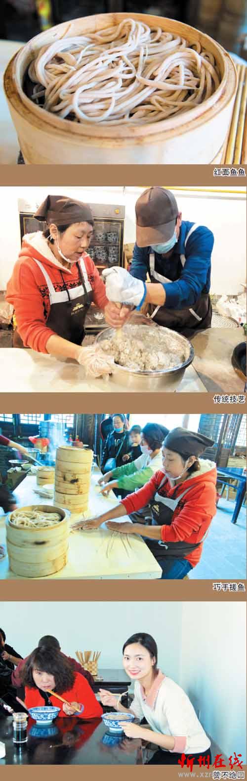 這家店的女主人叫康秀蘭,今年51歲,忻府區(qū)豆羅鎮(zhèn)韓溝村人。秀蘭從小勤快,幫助母親洗鍋?zhàn)鲲垼瑢W(xué)搓魚魚。18歲時(shí)便遠(yuǎn)近聞名,掌握了搓魚魚的好手藝。在今年忻州古城招商比賽入圍的6家店鋪中,秀蘭的小店脫穎而出,奪得第一名,拿到了開門店的資格。眼下夫妻二人經(jīng)營(yíng)著兩間大的門臉兒,小籠屜蒸魚魚,臊子有鮮肉蘑菇、西紅柿和老酸菜湯,食客們可根據(jù)自己的喜好選擇。他們兩口子既當(dāng)老板又是廚師。在食客多時(shí)臨時(shí)雇幾個(gè)幫工,小生意做得風(fēng)生水起??敌闾m告訴筆者,自開張以來(lái)食客不斷增加,國(guó)慶節(jié)假期期間一天的最高銷售紀(jì)錄是賣出200多籠紅面魚魚。