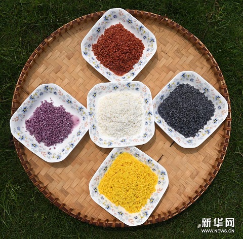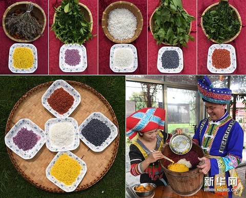上五圖:4種不同植物及其色素染成的糯米和原色糯米;下左圖:4種不同植物色素染成的糯米和原色糯米;下右圖:在廣西上林縣巷賢鎮(zhèn),兩名壯族村民在查看一桶剛剛蒸熟的五色糯米飯(拼版圖片,3月25日攝)。 每年“壯族三月三”到來(lái)之際,廣西的壯族同胞都有蒸制五色糯米飯迎接節(jié)日的習(xí)俗,以祈禱五谷豐登,五福臨門。這些五色糯米飯,主要采用天然植物萃取色素,將糯米分別浸泡到紫、黃、紅、黑4種不同植物色素的水里,充分染色后,與原色糯米一起蒸熟而成。色澤鮮艷、清香誘人的五色糯米飯,是“壯族三月三”接待來(lái)客時(shí)必不可少的傳統(tǒng)美食。新華社記者 陸波岸 攝