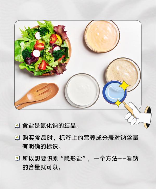 日常飲食要控鹽。有些食品嘗起來并不咸,但含鹽量卻相當(dāng)高,因?yàn)楹胁簧佟半[形鹽”。食鹽是氯化鈉的結(jié)晶,購買食品時,標(biāo)簽上的營養(yǎng)成分表對鈉含量有明確的標(biāo)識。所以想要識別“隱形鹽”,可以看標(biāo)簽上鈉的含量。(來源:科普中國)