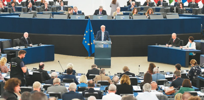 2018年9月12日,歐盟委員會主席容克(中)在法國斯特拉斯堡歐洲議會發(fā)表“盟情咨文”。主題為“歐洲主權(quán)時(shí)刻”,強(qiáng)調(diào)歐洲需要在塑造全球事務(wù)中發(fā)揮作用,包括提升歐元的國際地位等。(新華社/法新社)
