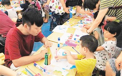 圖為臺(tái)灣實(shí)習(xí)生在北京首都圖書館少兒閱覽室教小朋友做手工。李晗雪 攝