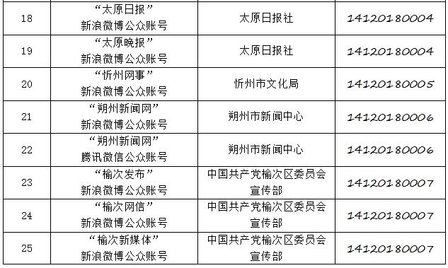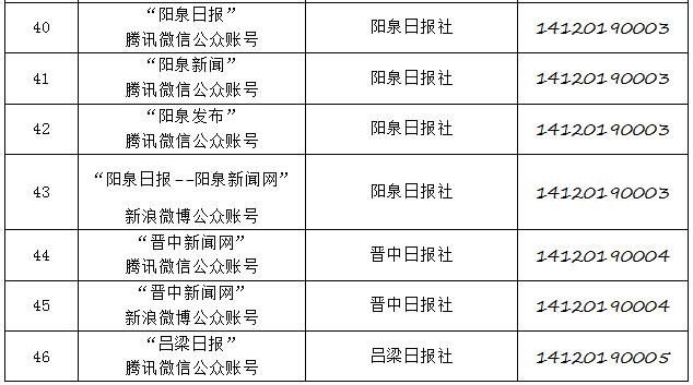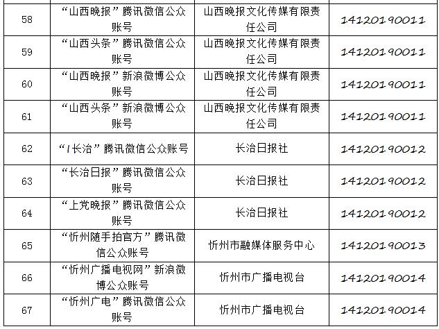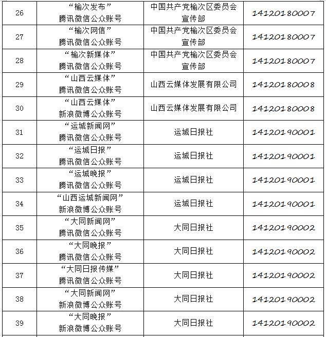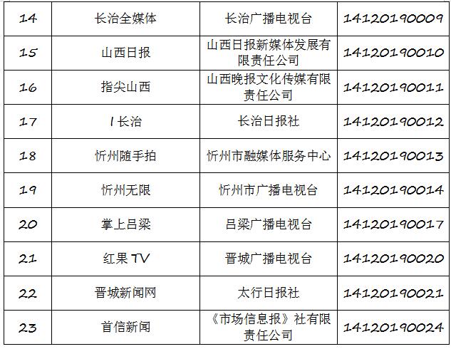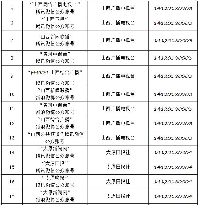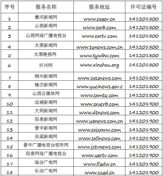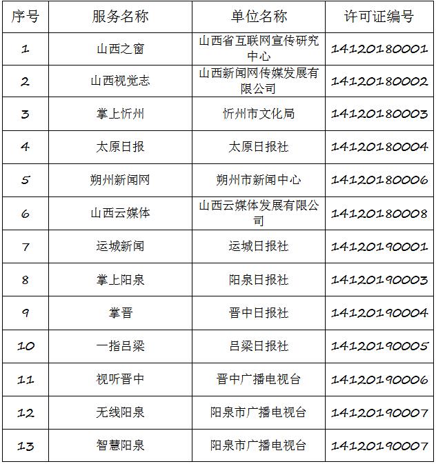 截至2019年8月6日,經(jīng)山西省互聯(lián)網(wǎng)信息辦公室許可的屬地互聯(lián)網(wǎng)新聞信息服務(wù)單位共計32家,具體服務(wù)形式包括:互聯(lián)網(wǎng)站33個,應(yīng)用程序23個,論壇1個,公眾賬號112個,共計169個服務(wù)項。