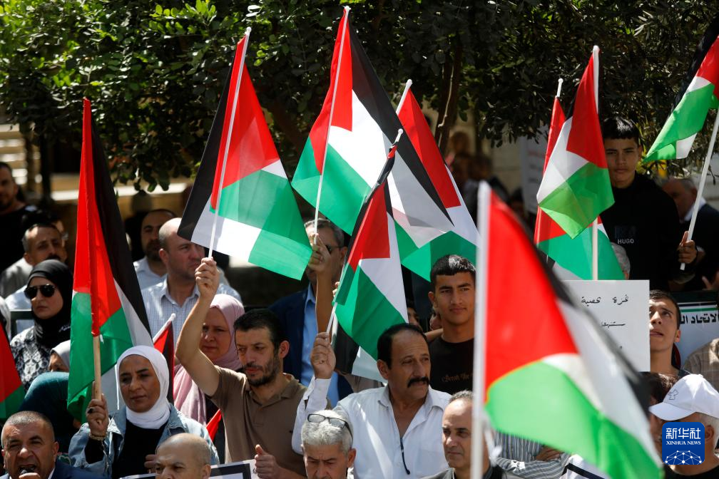 ??9月23日,在約旦河西岸城市希伯倫,民眾揮舞巴勒斯坦旗幟參加慶?;顒印P氯A社發(fā)(馬蒙·沃茲沃茲攝)