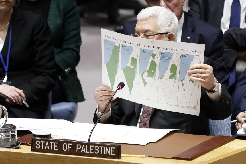 ??2020年2月11日,在位于紐約的聯(lián)合國總部,巴勒斯坦總統(tǒng)阿巴斯在安理會中東局勢和巴勒斯坦問題公開會上手持地圖發(fā)言。 新華社記者 李木子 攝