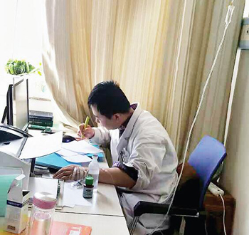 3月10日起,在微信朋友圈里,這張醫(yī)生掛吊瓶接診的照片引起了很多人的關(guān)注。照片中一名身穿白大褂的醫(yī)生正在值班室埋頭寫病歷,他的一只手上正輸著液體。筆者了解到,是一名病人的家屬上傳了這張照片。他的父親十幾天前曾在中醫(yī)院9樓心血管病房住院,在父親住院的一天,他去值班室詢問父親病情時,看到了徐強(qiáng)醫(yī)生打吊瓶堅(jiān)持工作,這讓他十分感動,于是就悄悄用手機(jī)拍了照并上傳至微信朋友圈。