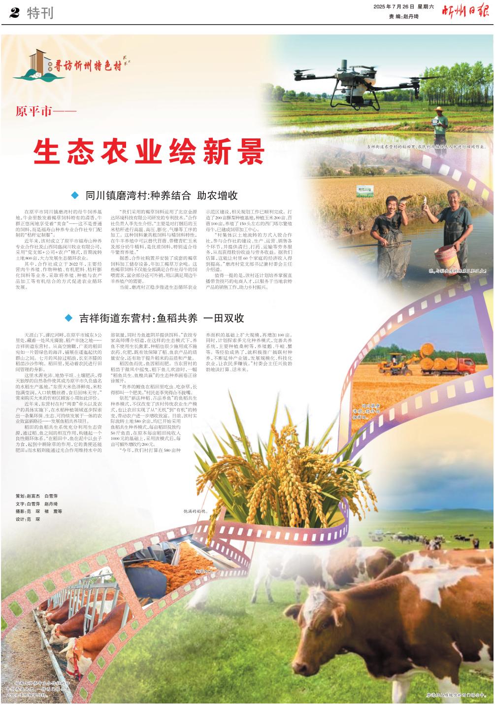 天涯山下,滹沱河畔,在原平市城東3公里處,藏著一處風(fēng)光旖旎、稻產(chǎn)豐饒之地——吉祥街道東營村。從高空俯瞰,廣袤的稻田宛如一片碧綠色的海洋,鋪展在逶迤起伏的群山之間。七月的風(fēng)掠過稻浪,長至齊膝的稻苗沙沙作響。稻田里,晃動(dòng)著農(nóng)民進(jìn)行田間管理的身影。