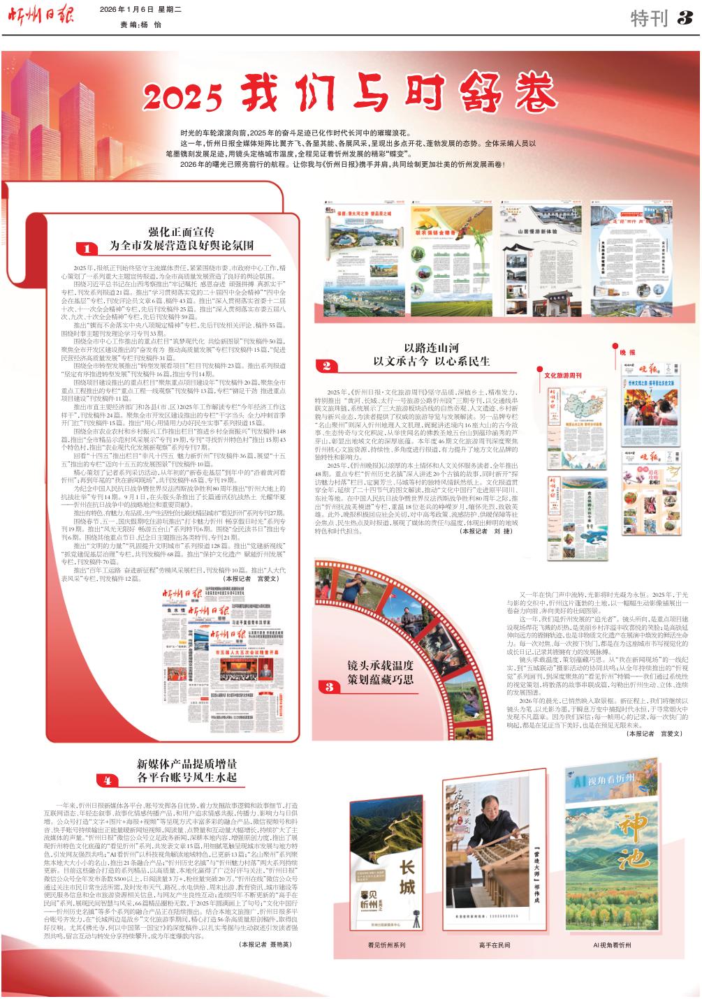 2025年,《忻州晚報》以濃厚的本土情懷和人文關(guān)懷服務(wù)讀者,全年推出48期。重點(diǎn)專欄“忻州歷史名鎮(zhèn)”深入講述20個古鎮(zhèn)的故事,同時新開“探訪魅力村落”欄目,定襄芳蘭、馬城等村的獨(dú)特風(fēng)情躍然紙上。文化報道貫穿全年,延續(xù)了二十四節(jié)氣的圖文解讀,推動“文化中國行”走進(jìn)原平同川、東社等地。在中國人民抗日戰(zhàn)爭暨世界反法西斯戰(zhàn)爭勝利80周年之際,推出“忻州抗戰(zhàn)英模譜”專欄,重溫18位老兵的崢嶸歲月,緬懷先烈,致敬英雄。此外,晚報積極回應(yīng)社會關(guān)切,對中高考政策、流感防護(hù)、供暖保障等社會焦點(diǎn)、民生熱點(diǎn)及時報道,展現(xiàn)了媒體的責(zé)任與溫度,體現(xiàn)出鮮明的地域特色和時代擔(dān)當(dāng)。(本報記者劉捷)