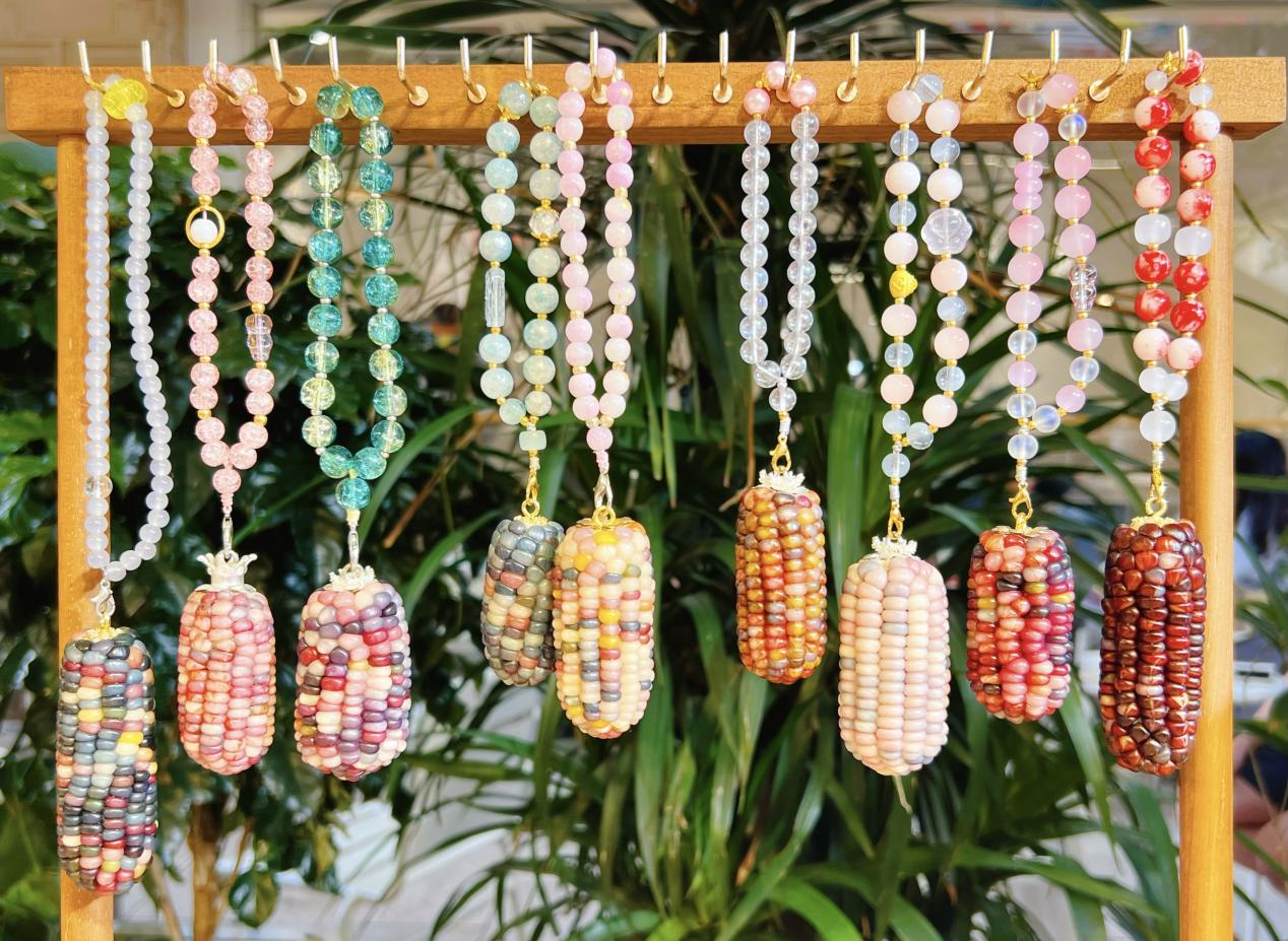 經(jīng)自然晾曬、人工精選、手工創(chuàng)意后,高顏值的玉米迎來(lái)了“七十二變”:配上木質(zhì)底座成為文玩擺件,單粒打孔輔以云南銀飾變成手鏈、鑰匙扣,掛飾、裝飾畫等。