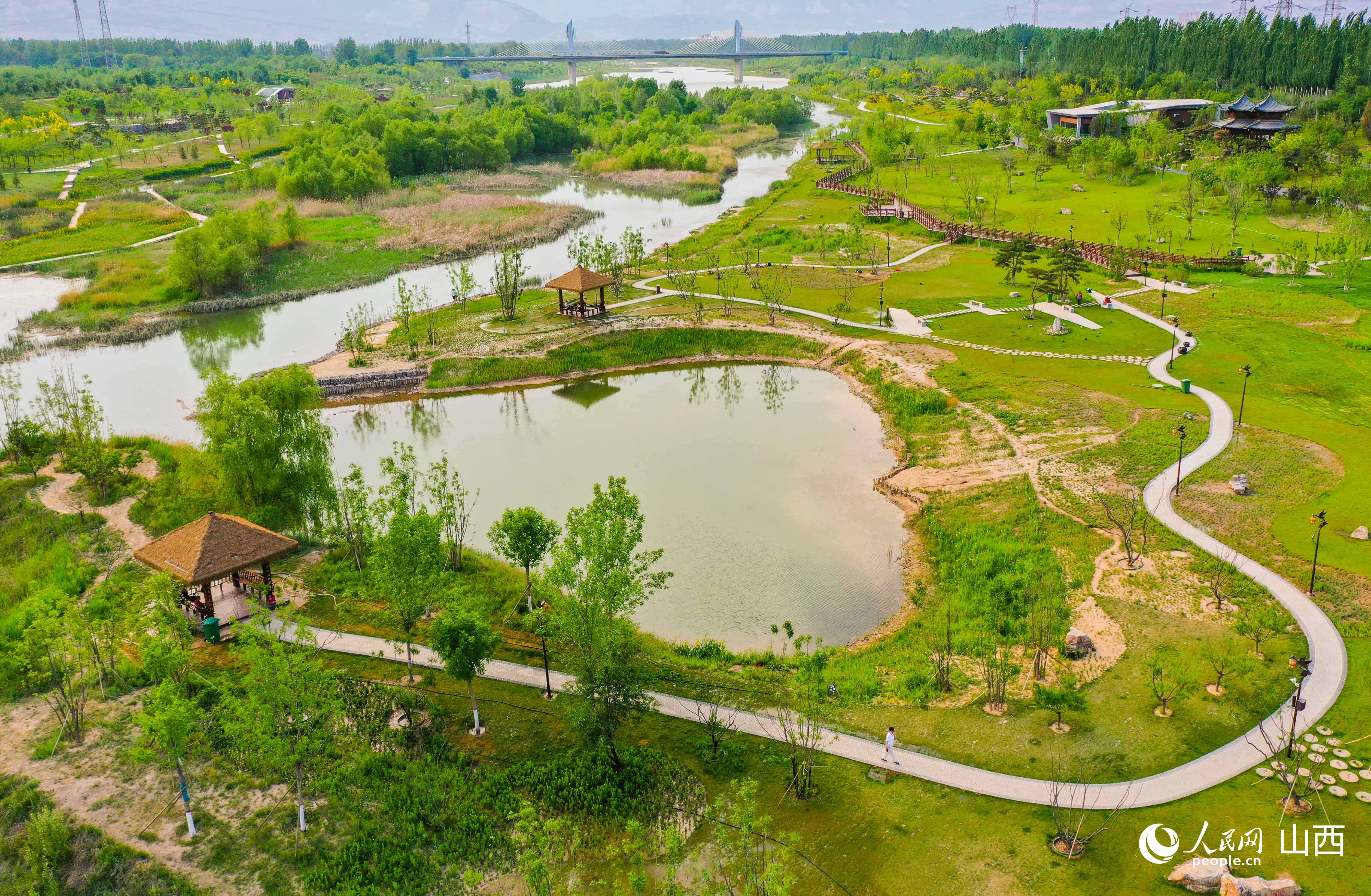6月22日,俯瞰山西太原汾河四期濕地公園,雁丘園綠意盎然,水面波光粼粼,一派生機(jī)盎然,勾畫出一幅自然和諧的生態(tài)美景。