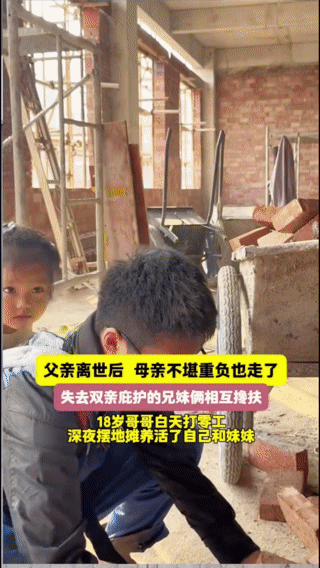 “18歲哥哥白天背著妹妹雙腳赤裸著在工地搬磚、深夜還要擺地攤,失去雙親庇護的兄妹倆相互攙扶……”