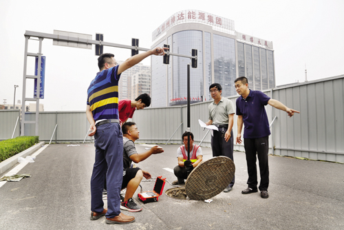 圖為技術(shù)人員現(xiàn)場檢測(cè)分析塌陷原因