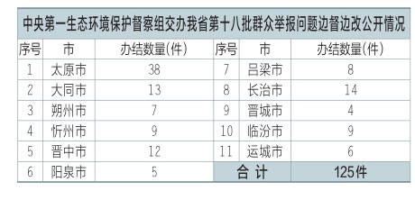 中央第一生態(tài)環(huán)境保護督察組交辦我省第十八批群眾舉報問題125件,辦結(jié)125件。公示125件,其中太原市38件、大同市13件、朔州市7件、忻州市9件、晉中市12件、陽泉市5件、呂梁市8件、長治市14件、晉城市4件、臨汾市9件、運城市6件??傻卿浬轿魇∪嗣裾W(wǎng)站或掃描二維碼查閱群眾信訪舉報轉(zhuǎn)辦和邊督邊改公開情況一覽表。